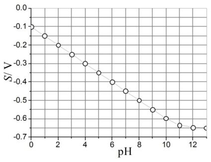 三、校正某一氫離子探測電極時,發現其訊號值(簡稱 S)與校正溶液的 pH 值存在如下圖所示的關係。