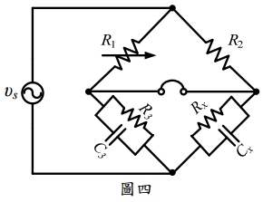 四、如圖四之並聯電容比較電橋,電源頻率為 50 Hz,當電橋平衡時各阻抗臂的元件值 分別為 R