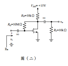 二、圖(二)所示為一共源極MOSFET放大器,利用汲極至閘極電阻RG作為偏壓。vi為 輸入訊號,經由一很大電容耦合至閘極。在汲極得到輸出訊號,經一很大電容耦合 至負載電阻RL,已知電晶體臨限電壓(threshold voltage)為Vt = 1.5V,電晶體之互 導參數為Kn = Kn'( W/L )= μ n Cox( W/L )= 0.25mA/V2,其中 μ n ,Cox,W,L各 L L 為表面通道(channel)電子之移動率、氧化層電容,通道寬度及通道長度,厄粒電 壓(Early voltage)為VA = 50V,試求