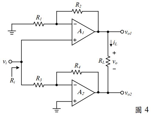 四、圖 4 為兩放大器並接,已知上放大器和下放大器的增益絕對值都是 K 倍,其中 R1 = R3 = 10 kΩ,R2 = 5 kΩ,R4 = 15 kΩ 及 RL = 8 Ω ,試求: