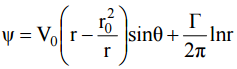 四、通過圓柱之勢能流(potential flow),若再加上環流(circulation)Γ,可約略模仿 通過旋轉圓柱的黏性流,其流線函數為: