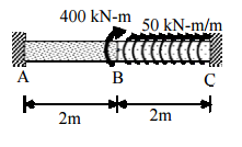三、實心圓桿 ABC 兩端固定,於 B 點受到集中扭矩 400kN-m 作用而在 BC 段受到 50kN-m/m 均佈扭矩,如圖所示。若 AB、BC 兩段的剪力模數(shear modulus)分 別為 40GPa 及 20GPa,而斷面直徑均為 50mm。