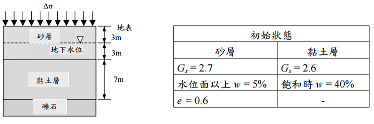 一、如圖所示,一厚度 7 m之黏土層其過壓密比(OCR)為 2。由壓密試驗所得之elog 曲線可知壓縮係數C