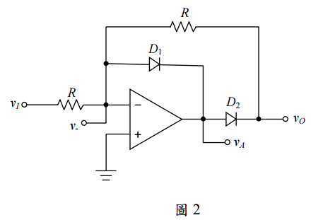 二、圖 2 電路中的運算放大器為理想運算放大器,其輸出飽和電位為±12V。二極體導通 時展現 0.7V的定電壓降,就下列條件求v
