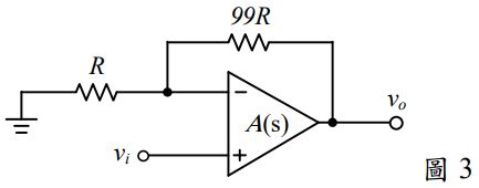 三、有一運算放大器(OP)的開迴路增益 Ao = 105 ,單極響應發生在 fp= 10 Hz,若 OP 的輸入阻抗無限大,輸出阻抗為零。此放大器連接成如圖 3 的結構,其低頻閉迴路增益為 100,試求: