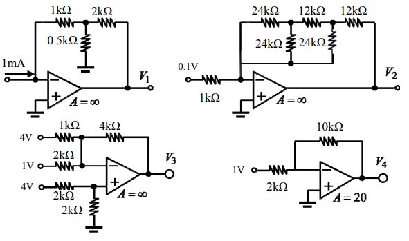 三、針對下列電路,運算放大器的放大倍率如圖所示,其他特性為理想的,試推導下列各電壓值: