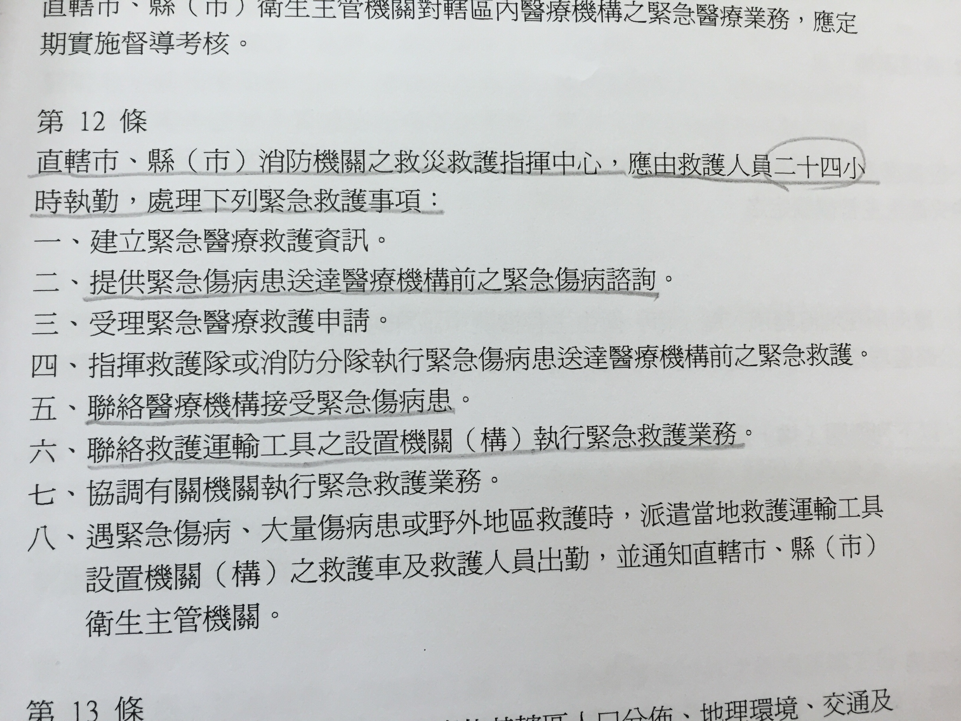 直轄市、縣(市)消防機關之救災救護指揮中心,應由救護人員二十四小時執勤,處理下列緊急救護事項: