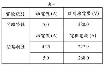 一、有一部額定容量為 150 kVA、額定電壓為 380 V(線電壓)、60 Hz、Y 接線之三相同步發電機,若對此同步發電機進行開路與短路特性實驗,其測試數據如表一所示,試求此三相同步發電機之百分比同步阻抗值約為何? (25 分)