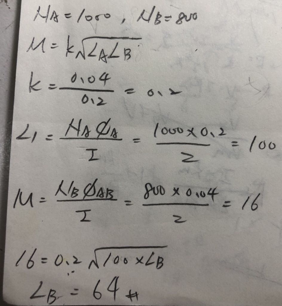 =800 匝,若線圈 A 通電流 2A,產生 0.2 韋伯的 磁通,其中 0.04 韋伯通過線圈 B,試求線圈 B 自感量 L