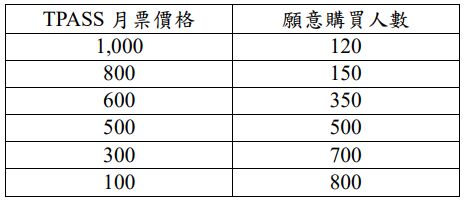 三、某縣市欲了解民眾對 TPASS 通勤月票之購買價格的想法,設計問卷並調查訪問 1,000 位當地民眾。下表為問卷受訪者對不同 TPASS 月票價格之願意購買人數統計表。