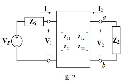 二、如圖 2 所示之雙埠網路(two-port network),已知 VS = 50∠0℃ Vrms、 ZS = 10 Ω、z11 = 40 Ω、z12 = 60Ω、z21 = 80Ω、z22 = 100Ω、ZL = 5 + j4 Ω, 試求負載 ZL 的平均吸收功率。(25 分)
