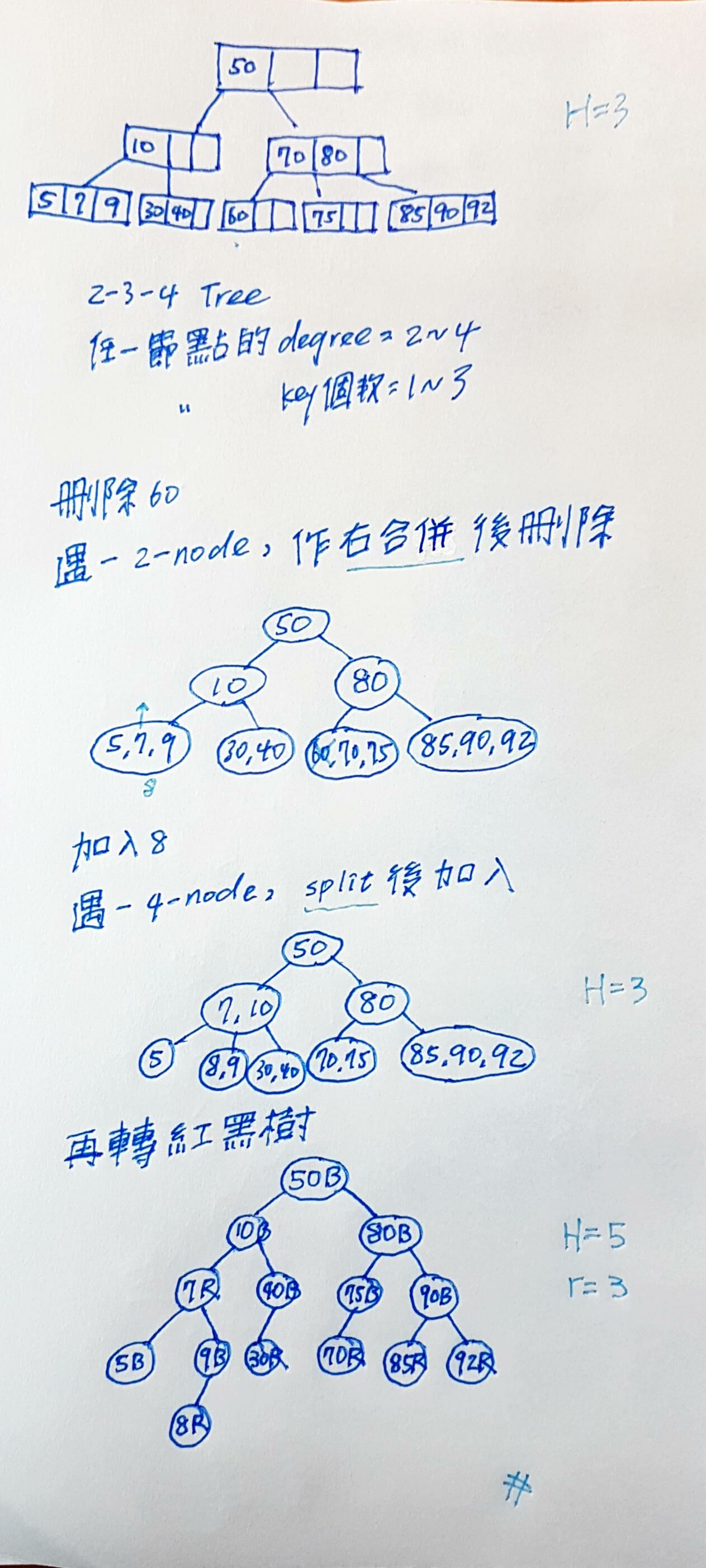 二、對下圖的 2-3-4 樹(2-3-4 tree)刪除 60,加入 8,再轉為紅黑樹(red black tree),請畫出 紅黑樹結果〔3-節點(3-node)分裂時,以較大鍵值為父節點(parent)〕。(20 分)
