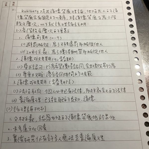 二、試述 Lawrence Kohlberg 的道德發展理論分為幾個層次與幾個階段?各 層次及各階段的重點分別為何?此理論有那些爭議?(25 分)