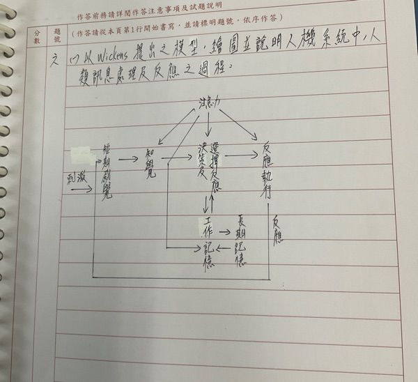 六、請以Wickens所提出之模型,繪圖並說明在人機系統中,人類訊息處理及反應之過程。(15分)