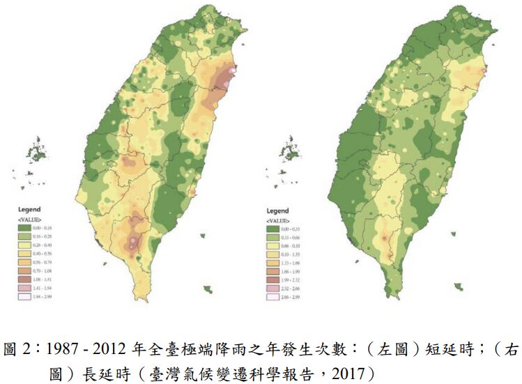 四、圖 2 為 1987 - 2012 年全臺極端降雨之年發生次數,請依據圖中資訊,簡要說明短延時、長延時空間分佈特徵為何?並依據此空間分佈特徵,說明其對各地區可能造成的災害衝擊為何?以及各地區該如何因應災害與調適?
