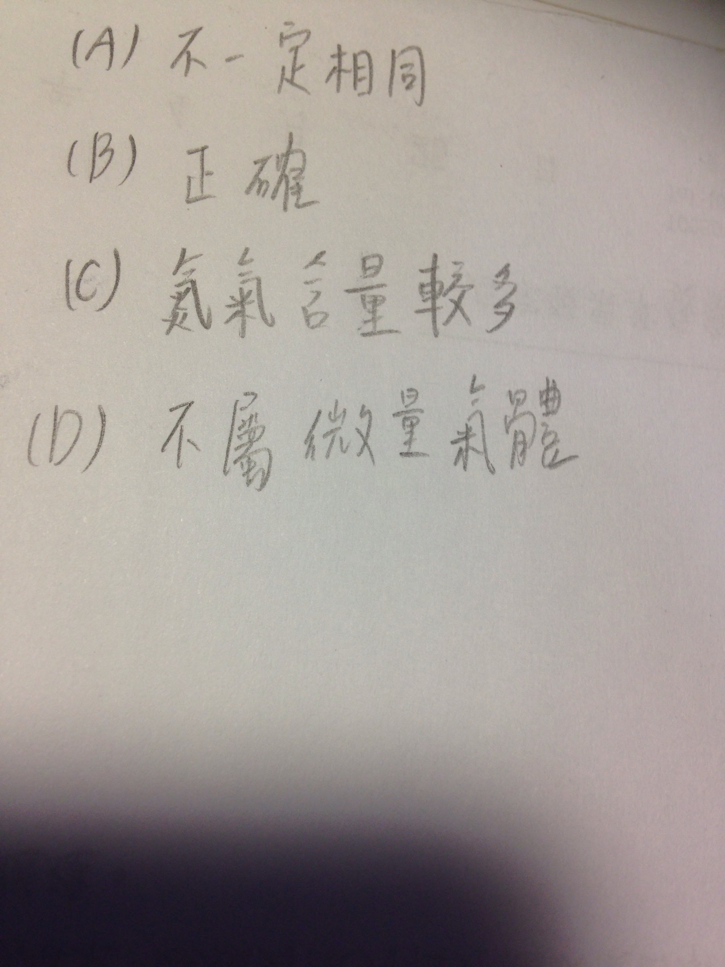 B,N2&O2為固定氣體,故無論何處的空氣 , 氮氣 都會是含量最多的氣體 , 氧氣含量第二多的氣體, 其餘氣體視地方而定。