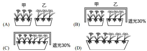 37. 某研究生將甲、乙兩種花卉植物,種植在成分相同的土壤內,分成(A)、(B)、(C)與(D)四組,如附圖所示, 其中(B)與(C)組遮光,降低光照 30%,用以觀察探討生態因子對這兩種花卉的可能影響。請依據圖文回 答下列問題: