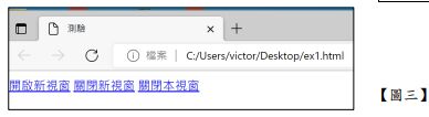 ●點選【圖三】之「關閉新視窗」超連結呼叫函式 CloseNewWindow(),請將此函式設計在