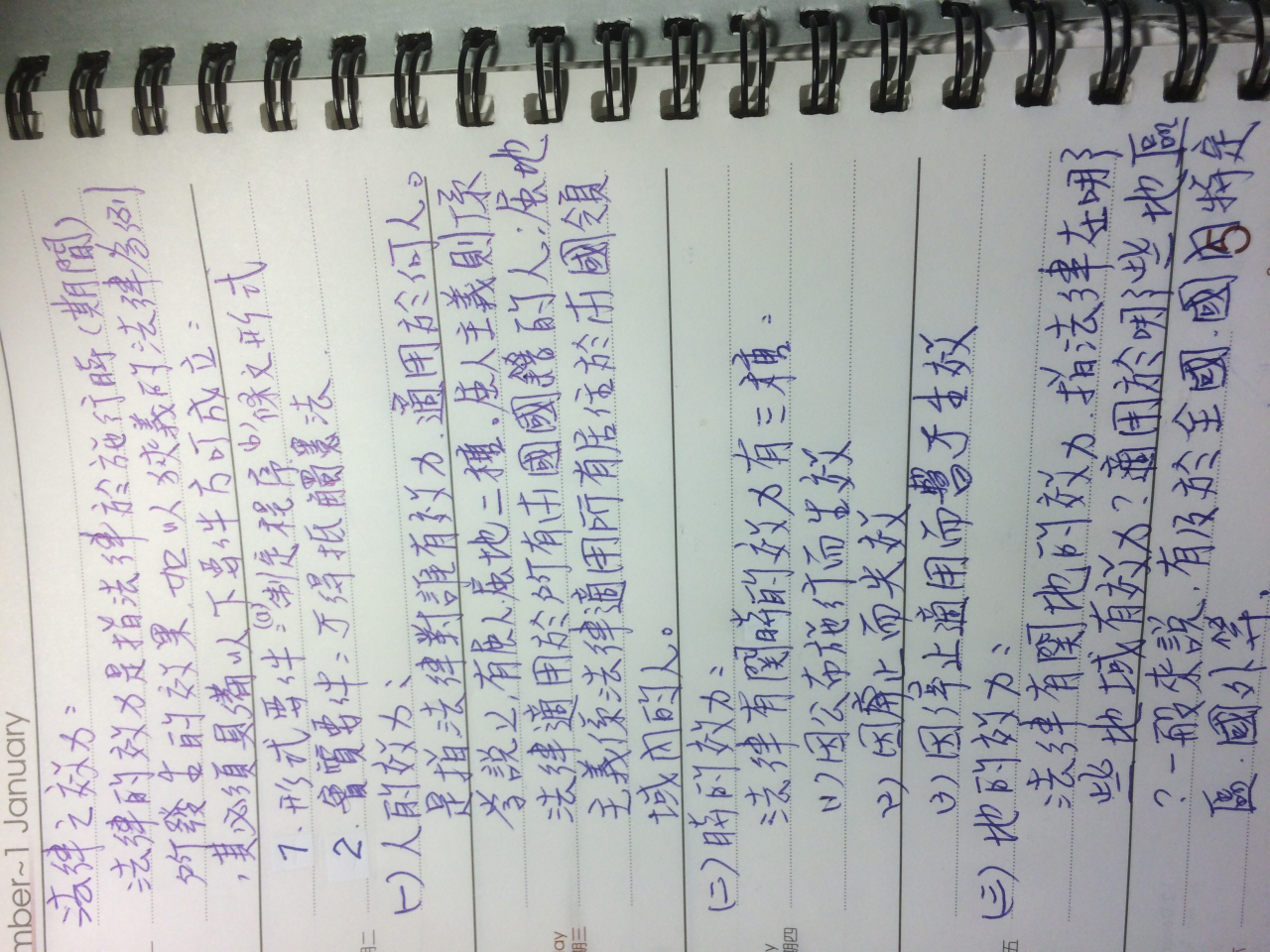 一、何謂法律 1. 憲法§34、中標法§4 法律應經立法院通過,總統公布,使得生效 2. 中標法§5 須由法律保留之事項、J443層級化法律保留 二、人的部分 1.定義 2.舉例:刑法§6~§7屬人主義、行政程序法§21當事人能力(訴願法§18、行政訴訟法§22) 三、時的部分 1.定義 2.舉例:刑法§80 追訴時效、民法§197I 損害賠償請求權之消滅時效、國賠法§13 國家求償權之消滅時效 四、地的部分 1.定義 2.舉例:刑法§3屬地主義、刑法§4隔地犯、訴願法§4I訴願管轄、法院組織法§9、§32、§48 法院管轄事件 3.居於補充地位:刑法§5 一至三款、五至七款保護主義;四款、八至九款世界主義