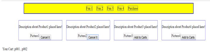1. 點選[Add to Carts]按鈕,會將項目編號加入購物車變數(myCarts),並顯示在第三 列資訊列上。同時,[Add to Carts]按鈕會改變成[Cancel It]按鈕。