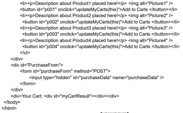 3. 點選[Purchase]按鈕會以 CGI 協定的 POST 方式向後端發出 request 需求:後端需 求 URL 是 : http://somecompanyXXX.com/purchase , request 參 數 包 括 purchaseData,內含使用者名稱(name)和項目編號清單(productIdList)。