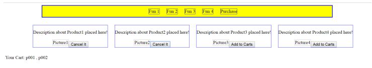 3. 再點選[Cancel It]按鈕,會將項目編號從購物車變數(myCarts)去除,並顯示最新 購物資料在第三列資訊列上。同時,[Cancel It]按鈕會改變成[Add to Carts]按鈕。