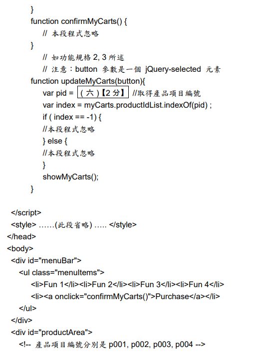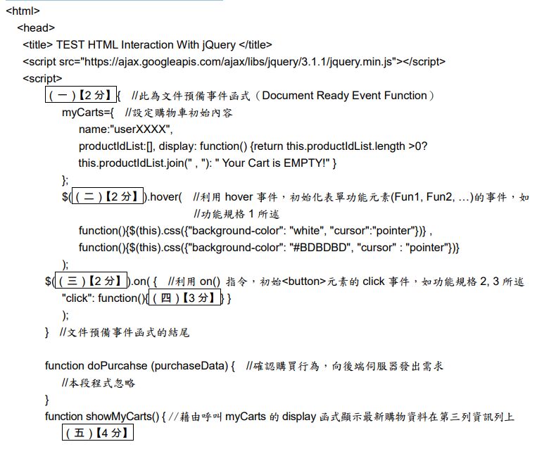 下面為網頁的程式碼片段(忽略相關 CSS 設定),請在適當位置填入程式碼(僅限 jQuery