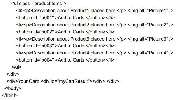 2. 點選[Add to Carts]按鈕,會將項目編號(藏在<button>標籤的 id 屬性內)加入購物 車變數(myCarts),並顯示在第三列資訊列上。同時,[Add to Carts]按鈕會改變成 [Cancel It]按鈕。