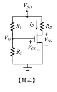 第三題: 如【圖三】所示為一 N 通道增強型 MOSFET,假設電路參數 R1= 30 KΩ,R2= 20 KΩ, RD= 20 KΩ,VDD = 5 V,VTN =1 V,Kn =0.1 mA/V2。請問:
