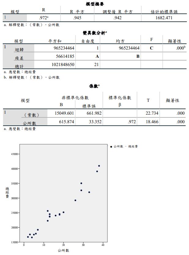 四、鄉(鎮、市、區)公所是推動「災害防救深耕計畫」的重要單位。張教授認為各縣市深耕計畫的經費,與該縣市的公所數目有密切關係,故蒐集各縣市深耕計畫經費(單位為千元)及公所數資料,運用統計軟體跑迴歸分析後,得到變異數分析表與迴歸係數表如下: