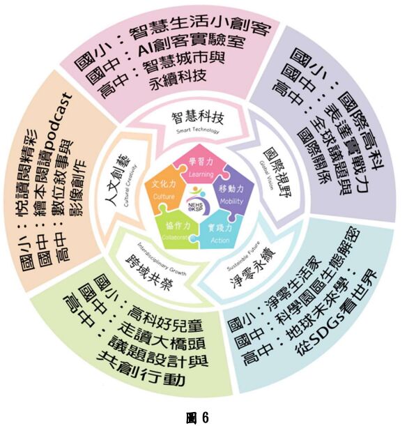 (1)請從圖6中的五個面向(智慧科技、國際視野、淨零永續、跨域共榮以及人文創藝)中自選一個面向,針對國中階段學生說明您期待他們在七~九年級,應各自達成的目標或展現的行為何?才能發展出符合本校期待之未來公民。