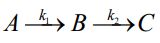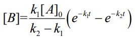 六、一階連續反應 ,A 之初濃度[A]0=1.0 mol dm-3 ,速率常數k1= 5 s -1 、 k2 =2s-1 ,且 B 濃度與時間(t)之關係為