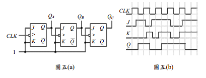 五、圖五(a)為 JK 正反器組成之計數器,圖五(b)為單一個 JK 正反器之時序表,CLK 為頻率 8 kHz 對稱之方波時脈(clock),電路在操作之前,Q