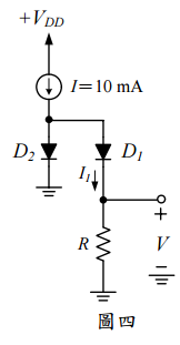 五、圖四中,若兩個二極體的特性相同,熱電壓(thermal voltage)V