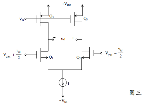 三、如圖三為以 PMOS 電晶體為電流源負載的 MOS 差動放大器,設 Q
