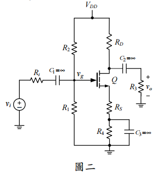 二、圖二為共源極放大器(common-source amplifier)電路,若 MOSFET 的輸出阻抗 r