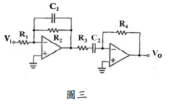 三、圖三是低通濾波器和高通濾波器串接形成的帶通濾波電路,中頻增益為 12 dB,3 dB 頻寬從 1 kHz 到 10 kHz。已知R