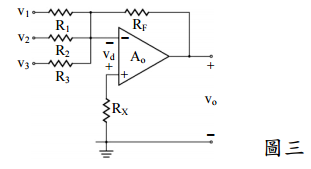 三、如圖三所示為三端輸入的運算放大器(op-amp),R