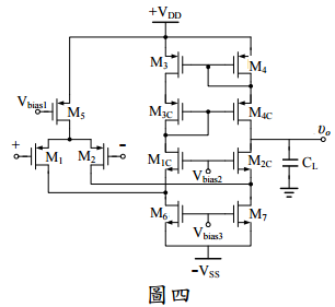 四、如圖四所示為一運算傳導放大器(Operational Transconductance Amplifier),試以電 路小訊號參數推導此放大器的:(每小題 10 分,共 20 分)