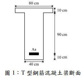 二、請針對圖 1 所示之 T 型鋼筋混凝土梁斷面,回答下列問題: