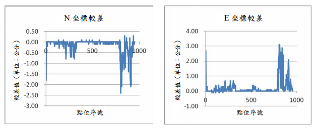 ⑵使用和第⑴小題相同的已知點,但將其中一些已知點視為未知點,而仍然固定其 他已知點以進行平差。 這兩種方法平差成果的各點位縱、橫坐標值的差異分別如下列圖所示。由這份資料 是否可以推論所使用的已知控制點含有系統誤差或粗差,又請從使用者精度上的要 求探討這兩份成果是否都可以接受?請解釋之。(25 分) N 坐標較差 E 坐標較差 較差值(單位:公分) 較差值(單位:公分) 點位序號 點位序號