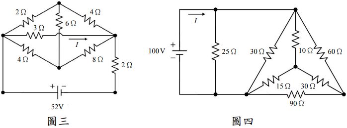 ⑵如圖四電路所示,求總電流 I 之值為多少?(15 分)