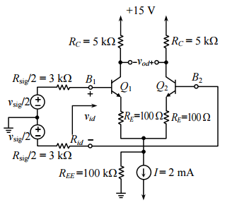 四、如圖的差動放大器電路,電晶體之β = 100,輸出電阻ro →∞。取熱電壓V