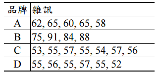 三、在 A, B, C, D 四種品牌的 C.D.中,做雜訊的測試,結果如下表: