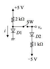 一、如下圖所示為一由二極體、電阻與開關構成的電路。假設兩個二極體導通時跨壓為 0.7 V,導通電阻極小。