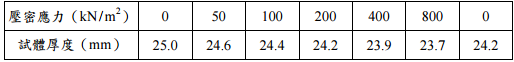 二、有一不擾動黏土試樣進行單向度壓密試驗,試體初始厚度為 25 mm,各階段經加載 24 小時後,試體厚度如表所示: