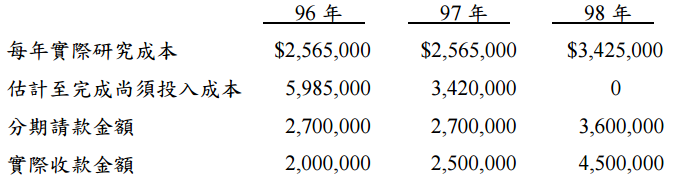 三、丙 公 司 為 一 研 究 機 構 , 於 96 年 初 接 受 委 辦 簽 訂 一 研 究 計 畫 案 , 合 約 價 格 為 $9,000,000,合約期間為 3 年。假設採用已發生成本占估計總成本之比例計算完成 程度,其相關資料如下:
