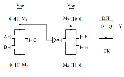 ⑵若正緣觸發暫存器(DFF)要讀出 Y 之正確值,且時脈(CK)與φ之頻率相同。 試描述 CK 上升緣(rising edge)與φ之上升緣的領先或落後關係並說明其理由。 (10 分)
