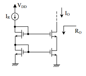 四、如下圖所示為一以 MOSFET 所組成的疊接電流鏡(cascode current mirror),四個 電晶體的特性完全相同。