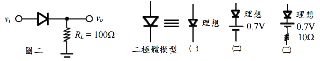 二、圖二中二極體有三種簡化的模型分別敘述如下,請就每一個模型,畫出圖二電路的 輸出輸入的特性轉換曲線。輸入的範圍為 − 5V ~ +5V ,轉折點的電壓與線段的斜率 均須標明。